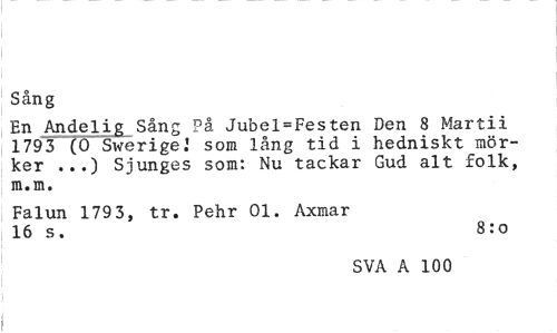 //// Sång //// En Andelig Sång På Jubel=Festen Den 8 Martii 1793 (O Sverige.* som lång tid i hedniskt mörker ...) Sjunges som: Nu tackar Gud alt folk, m.m. //// Falun 179 3, tr. Pehr 01. Axmar //// 16 s. 8:o //// SVA A 100 ////