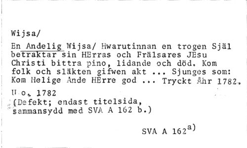//// Wijsa/ //// En Andelig Wijsa/ Hwarutinnan en trogen Själ betraktar sin HErras och Frälsares JEsu Chris ti bittra pino, lidande och död. Kom folk och släkten gifwen akt ... Sjunges som: Kom Helige Ande HErre god ... Tryckt Ahr 1782. //// U o* 1782 ^(Defekt; endast titelsida, sammansydd med SVA A 162 b.) //// SVA A 162a) ////