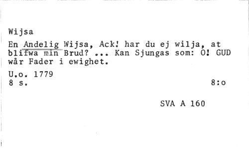 //// Wi jsa //// En Andelig Wijsa, Ack.' har du ej wilja, at blifwamin Brud? ... Kan Sjungas som: OJ GUD wår Fader i ewighet. //// U.o. 1779 //// 8 s. 8:o //// SVA A 160 ////