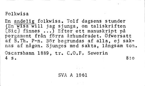 //// Folkwisa //// En andelig folkwisa. Tolf dagsens stunder (En wisa will jag sjunga, om taliskriften LSic] finnes ...) Efter ett manuskript på pergament från förra århundradet, öfwersatt af B.Th. P-n, Bör begrundas af alla, ej saknas af någon. Sjunges med sakta, långsam ton. //// Oscarshamn 1889, tr. C.O.F. Sewerin 4 s. 8:0 //// SVA A 10a) ////