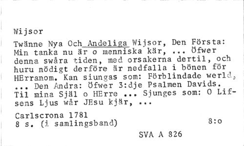 //// I //// Wi jsor //// Twänne Nya Och Andeliga Wijsor. Den Första: Min tanka nu är o menniska kär, ... öfwer denna swåra tiden, med orsakerna dertil, och huru nödigt derföre är nedfalla i bönen för HErranom. Kan siungas som: Förblindade werld^ ... Den Andra: öfwer 3:dje Psalmen Davids. Til mina Själ o HErre ... Sjunges som: 0 Lif-sens Ljus wår JEsu kjär, ... //// Carlscrona 1781 //// 8 s. (i samlingsband) 8:o //// SVA A 826 ////
