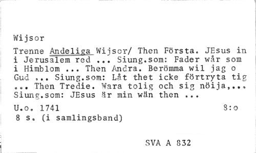//// Wi jsor //// Trenne Andeliga. Wijsor/ Then Första. JEsus in i Jerusalem red ... Siung.som: Fader wår som i Himblom ... Then Andra. Berömma wil jag o Gud ... Siung.som: Låt thet icke förtryta tig ... Then Tredie. Wara tolig och sig nöija,.., Siung.som: JEsus är min wän then ... //// U.o. 1741 8:0 //// 8 s* (i samlingsband) //// SVA A 832 ////