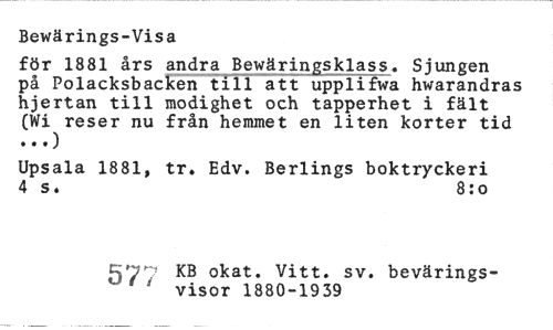 //// Bewärings-Visa //// för 1881 års andra Bewäringsklass. Sjungen på Polacksbacken till att upplifwa hwarandras hjertan till modighet och tapperhet i fält (Wi reser nu från hemmet en liten korter tid //// Upsala 1881, tr. Edv. Berlings boktryckeri 4 s. 8:o //// 577 KB okat. Vitt. sv. bevärings- //// ' ' visor 1880-1939 ////