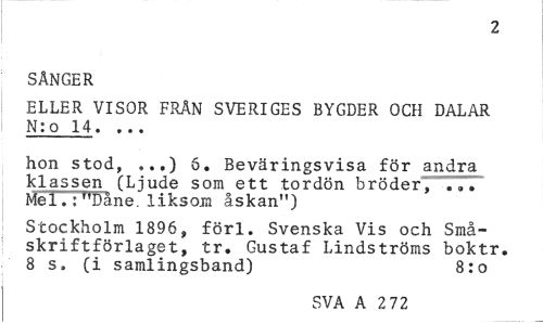 //// 2 //// SÅNGER //// ELLER VISOR FRÄN SVERIGES BYGDER OCH DALAR N:o 14. ... //// hon stod, 6. Beväringsvisa för andra //// klassen (Ljude som ett tordön bröder, .„, Mel.:"Däne. liksom åskan") //// Stockholm 1896, förl. Svenska Vis och Små-skriftförlaget, tr. Gustaf Lindströms boktr. 8 s. Ci samlingsband) 8:o //// SVA A 2 72 ////