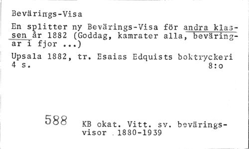 //// Bevärings-Visa //// En splitter ny Bevärings-Visa för andra klassen år 1882 (Goddag, kamrater alla, Feväringar i fjor ...) //// Upsala 1882, tr. Esaias Edquists boktryckeri 4 s. 8:o //// 588 KB okat. Vitt. sv. bevärings- //// visor .1880-1939 ////