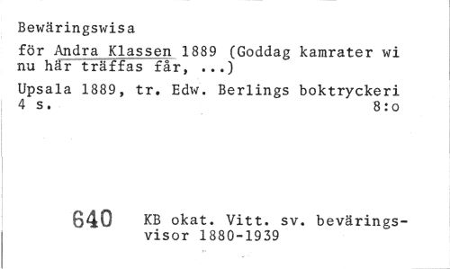 //// Bewäringswisa //// för Andra Klassen 1889 (Goddag kamrater wi nu här träffas får, ...) //// Upsala 1889, tr. Edw. Berlings boktryckeri 4 s . 8 : o //// ' r*>Of» ^B okat. Vitt. sv. bevärings- //// f6D visor 1880-1939 ////