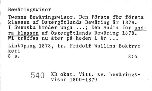 //// Bewärings=Wisor //// Twenne Bewäringswisor. Den Första för första klassen af Östergötlands Bewäring år 1878. I Swenska bröder unga ...; Den Andra för andra klassen af Östergötlands Bewäring 1878. WT*Träffas nu åter på heden i år ... //// Linköping 1878, tr. Fridolf Wallins Boktryckeri //// 8 s. 8:o //// 54Q KB okat. Vitt. sv. bevärings- //// ' visor 1800-1879 ////