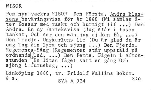 //// WISOR //// Fem nya vackra WISOR Den Första. Andra klassens be vä rings vi sa för år 1880 (Wi samlas å-ter Gossar med raskt och hurtigt lif Den //// Andra. En ny Kärleksvisa (Jag står i tusen tankar, Och ser den wän iag ej kan få, ...) Den Tredje. Ungkarlens lif (Du är glad du är ung Tag din lyra och sjung ...) Den Fjerde. Regements-Sång (Regementet står uppstäld på ordnandejTjled, ••») Qen Femte, Fågeln i aftonstunden (En liten fågel satt en gång Och sjöng i furuskog, .,.) //// Linköping 1880, tr. Fridolf Wallins Boktr. //// 8 S* SVA A 9 34 8:0 ////