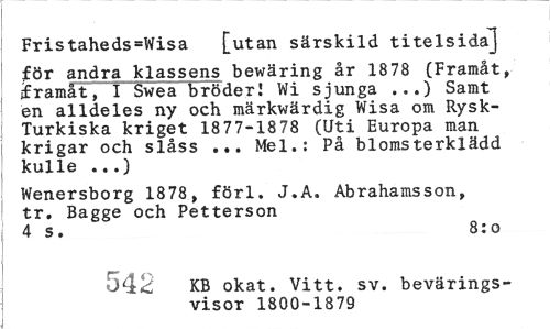 //// Fristaheds=Wisa [utan särskild titelsida] //// för andra klassens bewäring år 1878 (Framåt, framåt, I Swea bröder! Wi sjunga ...) Samt en alldeles ny och märkwärdig Wisa om Rysk-Turkiska kriget 1877-1878 (Uti Europa man krigar och slåss ... Mel.: På blomsterklädd kulle ...) //// Wenersborg 1878, förl. J.A. Abrahamsson, tr. Bagge och Petterson //// 4 s. 8:o //// _„ KB okat. Vitt. sv. bevärings- //// bUl visor 1800-1879 ////