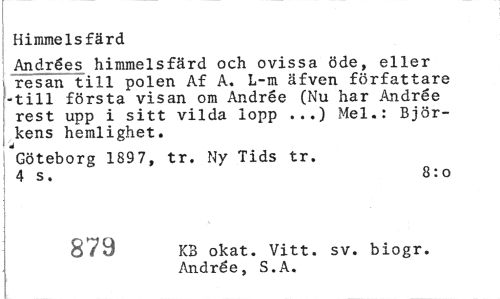 //// Himmelsfärd //// Andrées himmelsfärd och ovissa öde, eller resan till polen Af A. L-m äfven författare -till första visan om Andrée (Nu har Andrée rest upp i sitt vilda lopp ...) Mel.: Björ-| kens hemlighet. //// ¦ Göteborg 1897, tr. Ny Tids tr. //// s 4 s. 8:0 //// i //// 879 KB okat. Vitt. sv. biogr. //// Andrée, S.A. ////