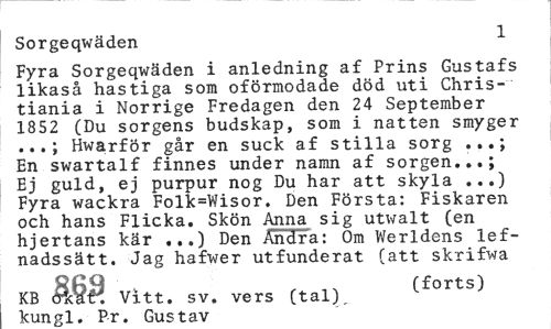 //// Sorgeqwäden //// Fyra Sorgeqwäden i anledning af Prins Gustafs likaså hastiga som oförmodade död uti Chris-tiania i Norrige Fredagen den 24 September 1852 (Du sorgens budskap, som i natten smyger ...; Hwarför går en suck af stilla sorg ...; En swartalf finnes under namn af sorgen...; Ej guld, ej purpur nog Du har att skyla ...) Fyra wackra Folk=Wisor. Den Första: Fiskaren och hans Flicka. Skön Anna sig utwalt (en hjertans kär Den Andra: Om Werldens lef- //// nadssätt. Jag hafwer utfunderat (att skrifwa //// KB Vitt. sv. vers (tal). (forts) //// kunpl. Pr. Gustav ////
