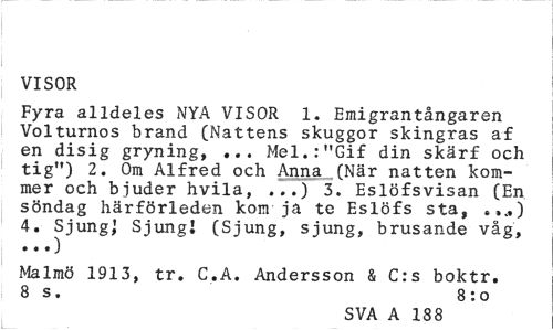 //// VISOR //// Fyra alldeles NYA VISOR 1. Emigrantångaren Volturnos brand (Nattens skuggor skingras af en disig gryning, ... Mel.:"Gif din skärf och tig") 2. Om Alfred och Anna (När natten kommer och bjuder hvila, ...) 3. Eslöfsvisan (En söndag härförleden kom jä te Eslöfs sta, ,,.,) 4. SjungJ SjungJ (Sjung, sjung, brusande våg, //// Malmö 1913, tr. C.A. Andersson & C:s boktr. //// 8 s. 8:o //// SVA A 188 ////