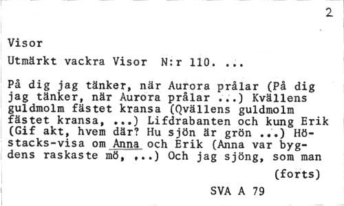 //// 2 //// Visor //// Utmärkt vackra Visor N:r 110. ... //// På dig jag tänker, när Aurora prålar (På dig jag tänker, när Aurora prålar ...) Kvällens guldmolm fästet kransa (Qvällens guldmolm fästet kransa, .?.) Lifdrabanten och kung Erik (Gif akt, hvem där? Hu sjön är grön ...) Hö-stacks-visa om Anna och Erik (Anna var bygdens raskaste mö, ,..) Och jag sjöng, som man //// (forts) //// SVA A 79 ////