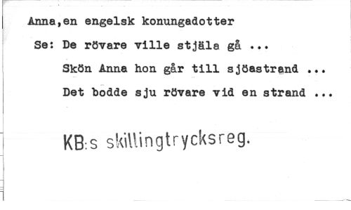 //// Anna,en engelsk konungadotter Se: De rövare ville stjäla gå ... //// Skön Anna hon går till sjöastrand ... Det bodde sju rövare vid en strand ... //// i KB:S skillin gtry eks reg. ////