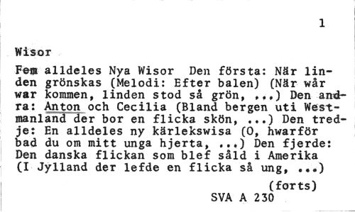 //// 1 //// Wisor //// Fem alldeles Nya Wisor Den första: När linden grönskas (Melodi: Efter balen) (När wår war kommen, linden stod så grön, ,,,) Den andra: Anton och Cecilia (Bland bergen uti West-manland der bor en flicka skön, ...) Den tredje: En alldeles ny kärlekswisa (0, hwarför bad du om mitt unga hjerta, ..,) Den fjerde: Den danska flickan som blef såld i Amerika (I Jylland der lefde en flicka så ung, ...) //// (forts) //// SVA A 230 ////