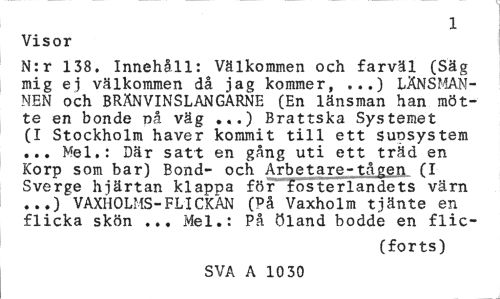//// 1 //// Visor //// N:r 138. Innehåll: Välkommen och farväl (Säg mig ej välkommen då jag kommer, ...) LÄNSMANNEN och BRÄNVINSLANGARNE (En länsman han mötte en bonde nå väg ...) Brattska Systemet (I Stockholm haver kommit till ett supsystem ... Mel.: Där satt en gång uti ett träd en Korp som bar) Bond- och Arbetare-tåjen (I Sverge hjärtan klappa för fosterlandets värn ...) VAXHOLMS-FLICKAN (På Vaxholm tjänte en flicka skön ... Mel.: På Öland bodde en flic- //// (forts) //// SVA A 10 30 ////