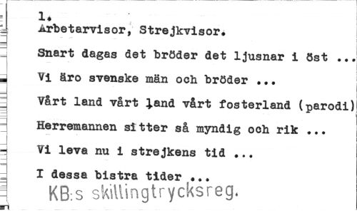 //// 1. //// y Arbetarvisor, Strejkvisor. //// Snart dagas det bröder det ljusnar i öst .., i Vi äro svenske män och bröder ... //// Vårt land vårt land vårt fosterland (parodi] Herremannen sitter så myndig och rik ... q Vi leva nu i strejkens tid ... 3 I dessa bistra tider ... //// 1 KB.s skillingtrycksreg. ////