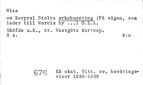 //// Wisa //// om Korpral Stolts arkebusering (På vägen, som leder till Warola by ...) ö".T7l. //// Sköfde u.å., tr. Vestgöta Korresp. 8 s. 8:0 //// KB okat. Vitt. sv. bevärings- //// visor 1880-1939 ////