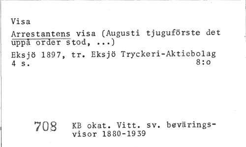 //// Visa //// Arrestantens visa (Augusti tjuguförste det uppå order stod, ...) //// Eksjö 1897, tr. Eksjö Tryckeri-Aktiebolag 4 s. 8:0 //// 708 KB okat' Vitt. sv. bevärings- //// visor 1880-1939 ////