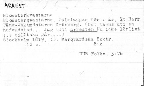//// Ke&gst //// B1 cmstfcrkvaatarne //// Blqmaterqwastarne. JulKlaopar f&r i ar, it Herr Fang-\Vaktmastaren Grönberg. (Det fanns uti en huf»«ud3ta«J.. . Jag till arresten Nu icke Icnligt i . . tillbaka gar, . ..) //// Stockholm l8l9, tr. Marqvardska Boktr. 12 s . 8; o //// UUB PollCT. 3:76 ////
