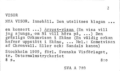//// 2 //// VISOR //// NYA VISOR. Innehåll. Den utslitnes klagan ... //// en konsert ...) Arrest-visan (En visa vill jag sjunga, -om Ni'vill höra på, ...) Den gräsliga Orkanvisan i Skåne (En väldig orkan hafver uppstått i Skåne, ... Mel.: Kometvisan af Chronvall. Eller ock: Sandals kanon) //// Stockholm 1909, förl. Svenska Visförlaget, tr. ös termalmstryckeriet 8 s. 8:o //// SVA A 780 ////