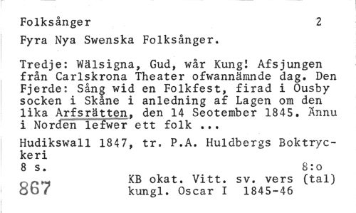 //// Folksånger 2 //// Fyra Nya Swenska Folksånger. //// Tredje: Wälsigna, Gud, wår Kung! Afsjungen från Carlskrona Theater ofwannämnde dag. Den Fjerde: Sång wid en Folkfest, firad i Ousby socken i Skåne i anledning af Lagen om den lika Arfsrätten, den 14 Seotember 1845. Ännu i Norden lefwer ett folk ... //// Hudikswall 1847, tr. P.A. Huldbergs Boktryckeri //// 8 s. 8: o //// r KB okat. Vitt. sv. vers (tal) //// öb/ kungl. Oscar I 1845-46 ////