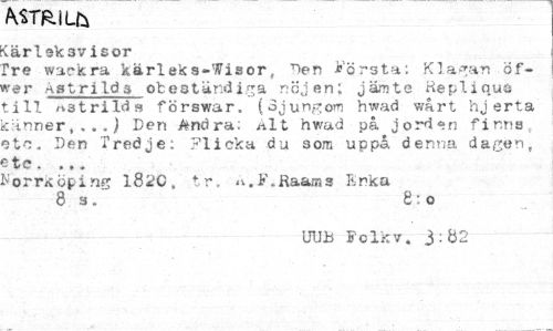 //// /WRILfr //// kärleksvisor //// Pr© wackra kärleks-Wisor, 'Hen Första; Klagan öf-ver Astrilds obeständiga nöjen; jämte Repliqua till nstriWs förswar, (3j ung om hwad wårt hj erta cänner,...) Den Andra: Alt hwad på jorden finna, 3tc. Den Tredje: Flicka du som uppå denna dagen, -tc. ... //// Norrköping 1820, tr. A.F.Raams Enka //// 8 s. 8:o //// UUB Folie v. 3:82 ////
