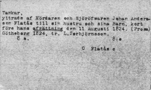 //// Tankar, //// yttrade af Mördaren och Sjöröfwaren Johan Änder», son Flata» till »in hustru ooh sina Barn, kort före han» ^f^Ättnia* den 11 Augusti 1824. (Prosa) Götheherg 1824, tr. L,Torbjörnsson. //// 6 8. 8;» //// O Flata» o //// 5 -'..-.••' : .:",'¦ ¦ V-'-- '. -i.-.--: ._¦" <•' .,:¦:< ' J-.^X V ////