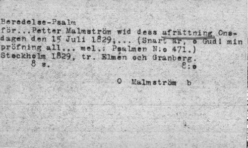 //// Beredelse-Psalm //// för...Petter Malmström wid dess afrättning Cna-dagen den 15 Juli lS29i... (Snart CT^-TTSua l min prof ning ali ... mel.; Psalmen N;o 471.) Steckholm 1829, tr. Bl»en och Granberg. 8 t. 8;e //// 0 Malmström h ////