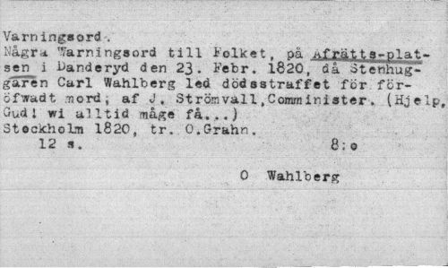 //// Varningsord. //// Några "Varningsord till Folket, oå Afrätt^s-plstt-sen i Uanderyd den 23. Febr. 1820, då Stenhuggaren Carl Wahlberg led dödsstraffet för för-öfwadt nord, af J. Strömvall .Comminister. (Hjelp, Gudl wi alltid måge få...) Stockholm 1820, tr. O.Grahn. //// 12 s. 8; o //// O Wahlberg ////