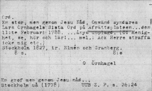 //// Crd * I i //// Er. stor, men genom Jesu Nåd , Gmwänd syndares Lars Crnhagels Sista Ord på Afrättsplatsen. ,»den 11; t e Februari 17 88. .., kryUOfJtffeU tW 'Menig-het, se, hcr och larl... mel,; Ack Herre straffa //// .icke mig etc .) //// Stockholm 1827, tr, F.lraén och Granberg, 8 s, 8; o //// 0 örnhage 1 TCr ^rof men genoTTt Jesu nåd , //// Stockholm uå (1778) UUB 2. P, s. 26;24 ////