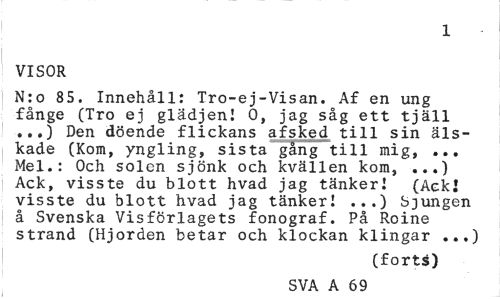 //// 1 //// VISOR //// N:o 85. Innehåll: Tro-ej-Visan. Af en ung fånge (Tro ej glädjen! 0, jag såg ett tjäll ...) Den döende flickans afsked till sin älskade (Kom, yngling, sista gång till mig, ... Mel.: Och solen sjönk och kvällen kom, ...) Ack, visste du blott hvad jag tänker! (Ack! visste du blott hvad jag tänker! ...) Sjungen å Svenska Visförlagets fonograf. På Roine strand (Hjorden betar och klockan klingar ...) //// (forts) //// SVA A 69 ////