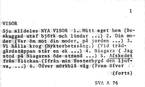 //// 1 //// VISOR //// Sju alldeles NYA VISOR 1. Mitt eget hem (Beskuggad utaf björk och lindar ...) 2. Din moder (Var öm mot din moder, på jorden „..) 3. Vi hålla krog (Nykterhetssång.) (Vid trädgårdstäppan står en ek «..) 4. Niagara ( Jag stod på Niagaras öde strand ...) 5. Afskedet från flickan (Ifrån min fosterbygd den 1jut-va, ...) 6, öfver mörkblå våg (Fram öfver //// {forts) //// SVA A 209 ////