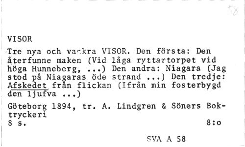 //// VISOR //// Tre nya och vackra VISOR. Den första: Den återfunne maken (Vid låga ryttartorpet vid höga Hunneberg, ...) Den andra: Niagara (Jag stod på Niagaras öde strand ...) Den tredje: Afskedet från flickan (Ifrån min fosterbygd den 1jufva ...) //// Göteborg 1894, tr. A. Lindgren & Söners Bok- //// tryckeri //// 8 s. 8:o //// SVA A 58 ////