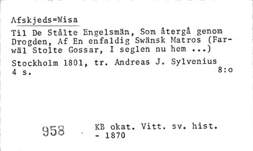 //// Afskjeds-Wisa //// Til De Stålte Engelsmän, Som återgå genom Drogden, Af En enfaldig Swänsk Matros (Far-wäl Stolte Gossar, I seglen nu hem ...) //// Stockholm 1801, tr. Andreas J. Sylvenius 4 s. 8:0 //// qco KB okat. Vitt. sv. hist. //// 3UO _ ig70 ////
