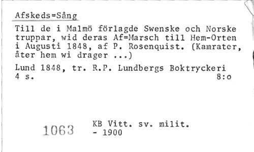//// Afskeds=Sång //// Till de i Malmö förlagde Swenske och Norske truppar, wid deras Af=Marsch till Hem-Orten i Augusti 1848, af P. Rosenquist. (Kamrater, åter hem wi drager ...) //// Lund 1848, tr. R.P. Lundbergs Boktryckeri 4 s. 8:o //// KB Vitt. sv. milit. //// lubd - 1900 ////