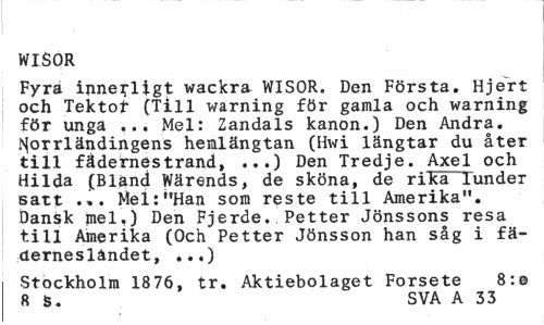 //// WISOR //// Fyra innerligt wackra WISOR. Den Första. Hjert och Tektot (Till warning för gamla och warning för unga ... Mel: Zandals kanon.) Den Andra. I^orrländingens hemlängtan (Hwi längtar du åter till fädernestrand, ...) Den Tredje. Axel och Hilda (Bland Wärends, de sköna, de rika lunder satt ... Mel:"Han som reste till Amerika". Dansk mel,) Den Fjerde. Petter Jönssons resa till Amerika (Och Petter Jönsson han såg i fäderneslandet, ...) //// Stockholm 1876, tr. Aktiebolaget Forsete 8:0 //// 8 5. SVA A 33 ////