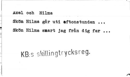 //// Axel och Hilma //// Skön Hilma går uti (Aftonstunden ... Skön Hilma snart jag från dig far ... //// KB:s skiUingtrycksreg. //// r ////