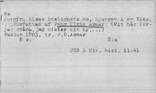 //// , Ro //// ! Jur.gfru Jiisan lirislighets Ko, Jjungen i er Wi au, . . .Författad af Po/ir l'.^..r.i.cr, Axftiar • (NT! i hår rör-j a r gråna, jag n i st er min hy^TTT") Fahlun 1803, tr. P.O.Axmar //// 8 s. 8:0 //// UUB Z L'tv . bi st. 11 ;41 ////