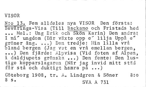 //// VISOR //// N:q 13. Fem alldeles nya VISOR Den första: Bevärings-Visa (Till Backario och Fristads hed ... Mel»: Ung Erik och Skön Karin) Den andra: I mi*" ungdom (Där växte opp e" lilja Uppå e* gröner äng, .,,) Den tredje: Min lilla vrå bland bergen (Jag vet en vrå emellan bergen, ,..) Den fjärde: Alpvisa (Vid foten af Alpen, i daldjupets grönska ...) Den femte: Den lustige kopparslagaren (När jag invid mitt städ får stå och duktigt hamra pa ...) //// Göteborg 1908, tr, A. Lindgren & Söner 8:0 //// 8 S# SVA A 731 ////