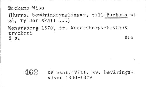 //// Backanio-Wisa //// (Hurra, bewäringsynglingar, till Backamo vi gå, Ty der skall ...) //// Wenersborg 1870, tr. Wenersborgs-Postens tryckeri //// 8 s. 8:0 //// tny KB okat. Vitt. sv. bevärings- //// - '^ visor 1800-1879 ////