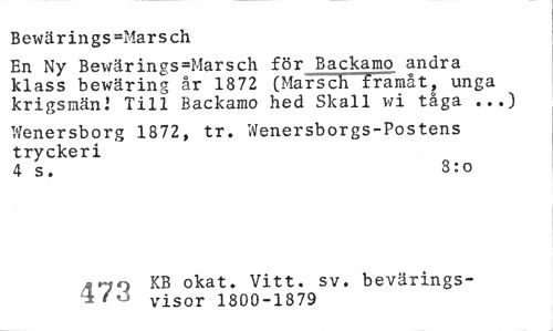 //// Bewärings=Marsch //// En Ny Bewärings=Marsch för Backamo andra klass bewäring år 1872 (Marsch framåt, unga krigsmän] Till Backamo hed Skall v/i tåga ...) //// Wenersborg 1872, tr. Wenersborgs-Postens tryckeri //// 4 s. 3:o //// tny KB okat. Vitt. sv. bevärings- //// - '^ visor 1800-1879 ////