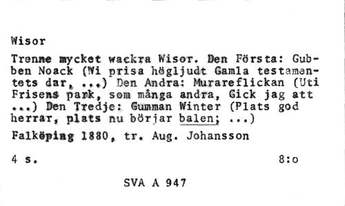 //// Wisor //// Trenite mycket vraekra Wisor. Den Första: Gubben Noack (Wi prisa högljudt Gamla testamentets dar# ., ?) Den Andra: Murareflickan (Uti Frisens park, som många andra, Gick jag att • *.) Den Tredje: Gumman Winter (Plats god herrar, plats nu börjar balen; ...) //// Falköping 1880, tr. Aug. Johansson 4 s. 8:0 //// SVA A 947 ////