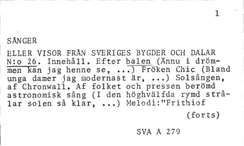 //// 1 //// SÅNGER //// ELLER VISOR FRÅN SVERIGES BYGDER OCH DALAR N:o 26. Innehåll. Efter balen (Ännu i dröm-men kan jag henne se, ..71 Fröken Chic (Bland unga damer jag modernast är, ...) Solsången, af Chronwall. Af folket och pressen berömd astronomisk sång (I den höghvälfda rymd strålar solen så klar, ...) Melodi:"Frithiof //// (forts) //// SVA A 279 ////