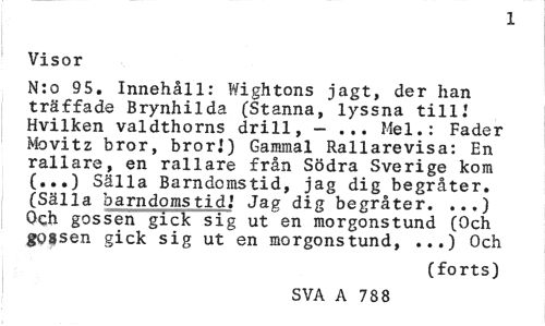 //// 1 //// Visor //// N:o 95. Innehåll: Wightons jagt, der han träffade Brynhilda (Stanna, lyssna till I Hvilken valdthorns drill, - ... Mel.: Fader Movitz bror, brorj) Gammal Rallarevisa: En rallare, en rallare från Södra Sverige kom (...) Sälla Barndomstid, jag dig begråter. (Sälla barndomstid.' Jag dig begråter. ...) Och gossen gick sig ut en morgonstund (Och gossen gick sig ut en morgonstund, ...) Och //// (forts) //// SVA A 788 ////