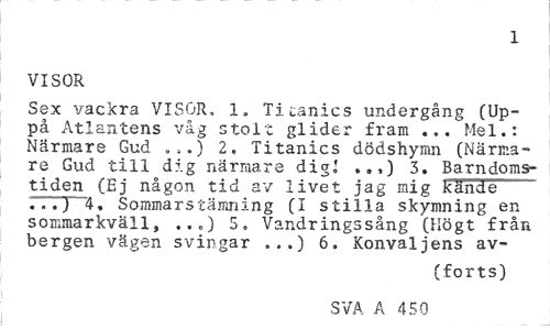 //// 1 //// VISOR //// Sex vackra VISOR, 1. Ticanics undergång (Up-på Atlantens våg stolt glider fram Mel.: Närmare Gud „*.) 2, Titanics dödshymn (Närmare Gud till d?'.g närmare dig.! .»,) 3. Barndomstiden (Ej någon tid av livet jag mig kände ...) '4, Sommarstämning (I stilla skymning en sommarkväll, ..«,) 5» Vandringssång (Högt från bergen vägen svingar „..) 6. Konvaljens av- //// (forts) //// SVA A 450 ////