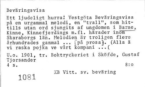 //// Beväringsvisa //// Ett ljudeligt hurra! Vestgöta Beväringsvisa på en urgammal melodi, en "trall", som hittills utan ord sjungits af ungdomen i Barne_, Kinne, Kinnefjerdings m.fl. härader inom Skaraborgs län. Melodien är troligen flere århundrades gammal ... fpå prosaj. (Alla ä vi raska pojka ve vårt kompani ...( //// U.o. 1901, tr. Boktryckeriet i Sköfde, Gustaf Tjorsander //// 4 s. 8:0 //// KB Vitt. sv. beväring //// 1081 ////