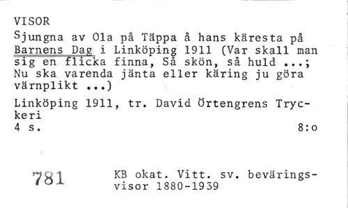 //// VISOR //// Sjungna av Ola på Täppa å hans käresta på Barnens Dag i Linköping 1911 (Var skall man sig en flicka finna, Så skön, så huld Nu ska varenda jänta eller käring ju göra värnpli kt •••) //// Linköping 1911, tr. David örtengrens Tryckeri //// 4 s. 8:o //// 701 KB okat. Vitt. sv. bevärings- //// ' ox visor 1880-1939 ////