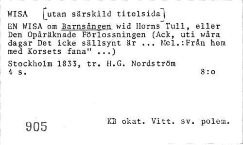 //// WISA j utan särskild titelsida~| //// EN WISA om Barnsången wid Horns Tull, eller Den Opåräknade Förlossningen (Ack, uti wåra dagar Det icke sällsynt är ... Mel. ".Från hem med Korsets fana" ...) //// Stockholm 1833, tr. II.G. Nordström 4 s. 8:0 //// nnr- KB okat. Vitt. sv. polera. //// uuo ////