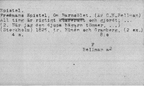 //// Epistel. //// ?redmans Epistel, Om Ti&rnsölet. (av C .M» B el l-« an) Ml ting iir ri.eti^t llfWIft och gjordt; ... ¦2, Sär jag den djupa bäcrarn tömmer, . . .) (Stockholm) l82c, tr. Slmén och Granberg, f2 sxj 4 s. 8;o //// F //// Beliman a2 ////